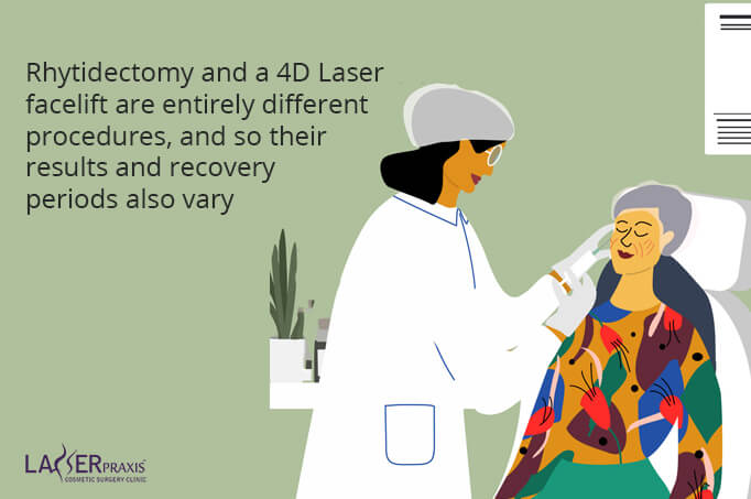 Rhytidectomy and a 4D Laser facelift are entirely different procedures, and so their results and recovery periods also vary. Given below are some of these key differences: