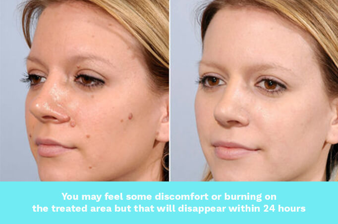 The skin might appear a little discolored after the treatment and in some cases a thin scab might also develop. However, these marks will disappear over the two weeks following the treatment.